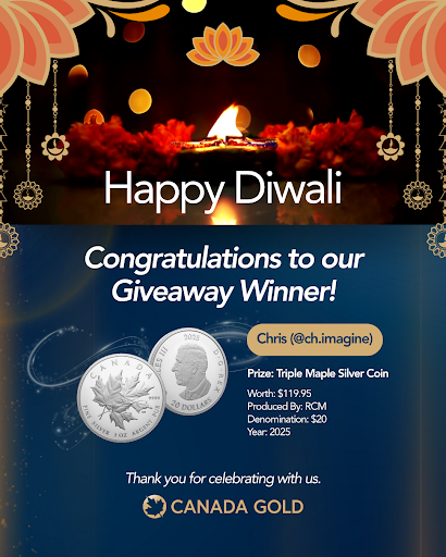 Our Diwali Giveaway featured a stunning prize: the 2025 $20 Triple Maple Pure Silver Coin, beautifully crafted by the Royal Canadian Mint and valued at $119.95.